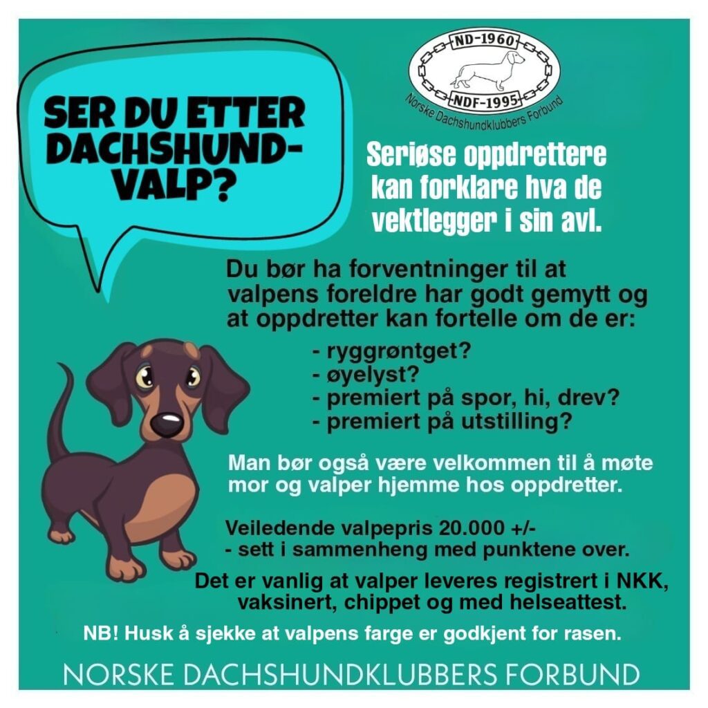 OPPDRETTERE Valpeannonser finner du hos Norske Dachshundklubbers Forbund Kennel Hundholmen Kennel Kjerrantunet Kennel Lofotdachsen Kennel Eran Star Dersom du er oppdretter og medlem i Nordland Dachshundklubb, og ønsker å stå på denne siden. Send en mail til nordland@dachshundklubb.no med navn og link til hjemmeside.